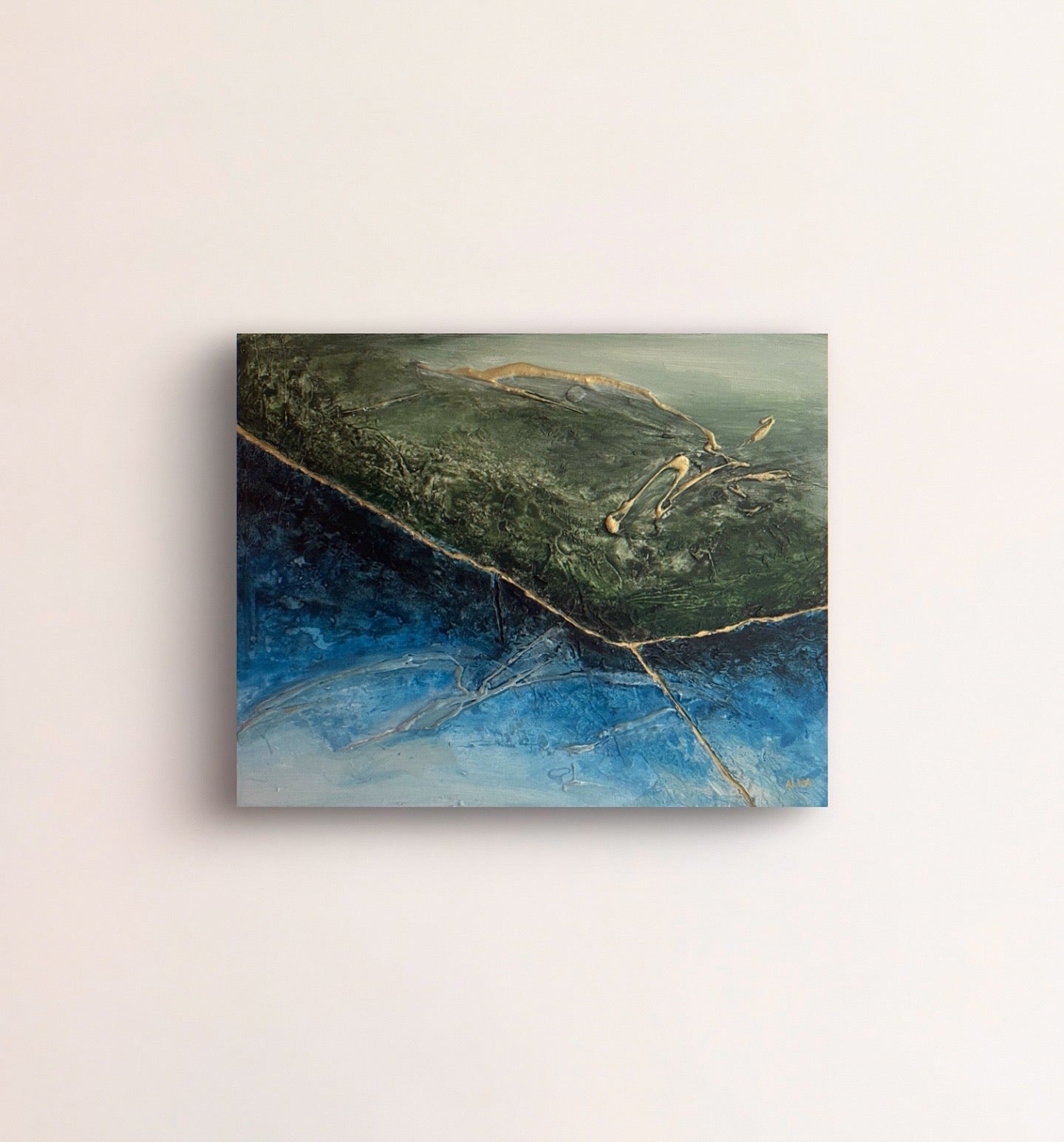 Incontro tra due anime, due terre che si sfiorano e si fondono, rivelando un legame profondo e indivisibile. Napoli, con il suo mare intenso e avvolgente, si riversa nei toni del blu che dominano la parte inferiore dell’opera. È un blu che evoca la profondità del Golfo, il respiro del Vesuvio e l’energia vibrante di una città che vive e pulsa in ogni sua sfumatura. Avellino, emerge dal verde della parte superiore, un verde che richiama le colline, le foreste rigogliose e la pace che solo la natura sa donare. È un luogo di radici profonde, di quiete e riflessione, dove il tempo sembra rallentare per permettere all’anima di respirare.