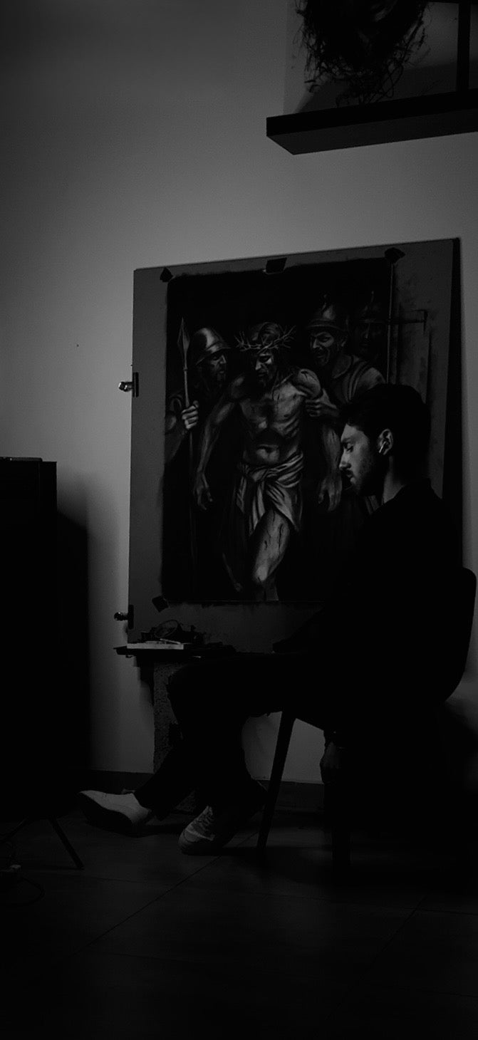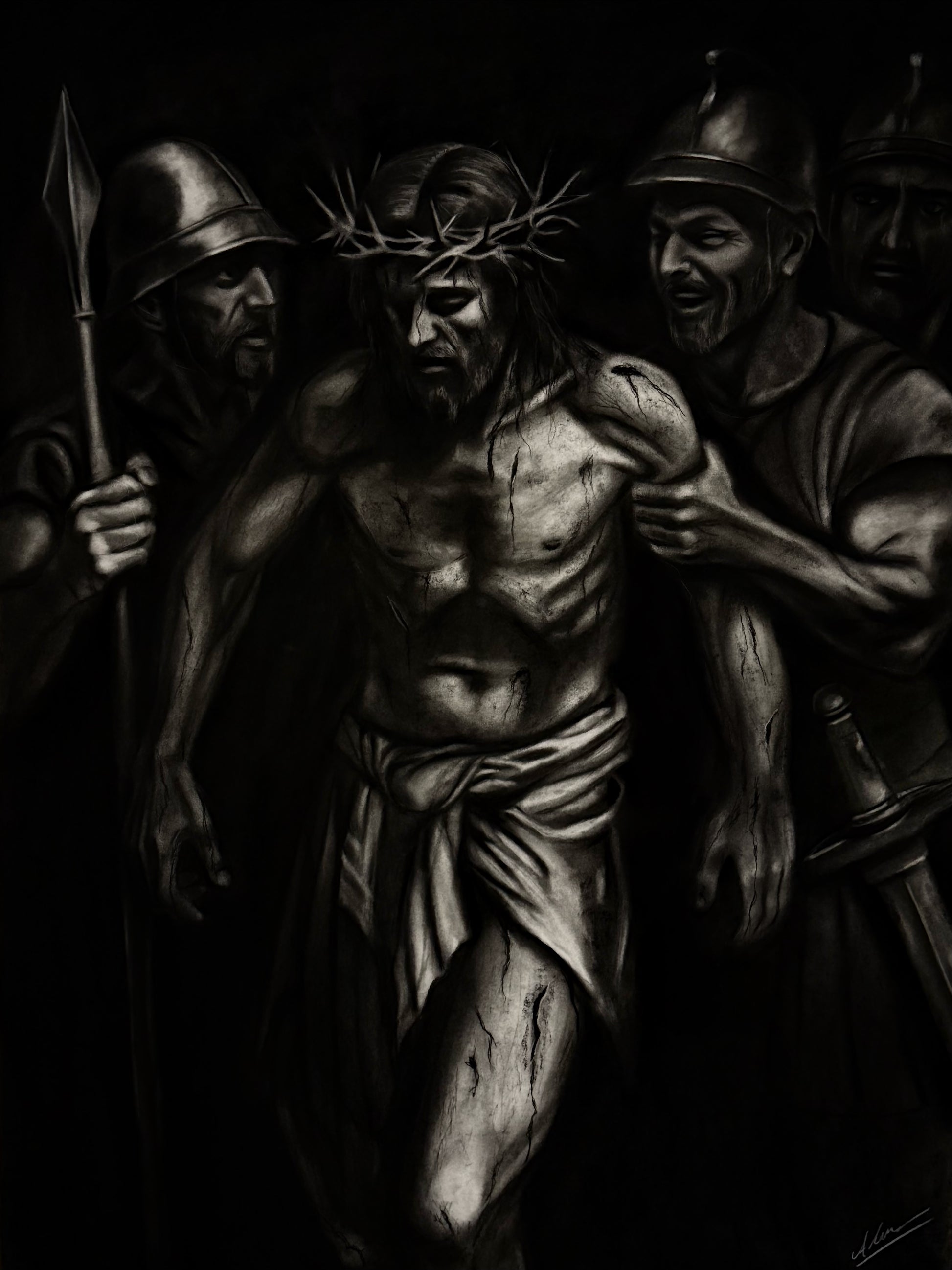 Il contrasto tra i neri intensi e i punti luce del carboncino diventa il linguaggio visivo di questo conflitto interiore.