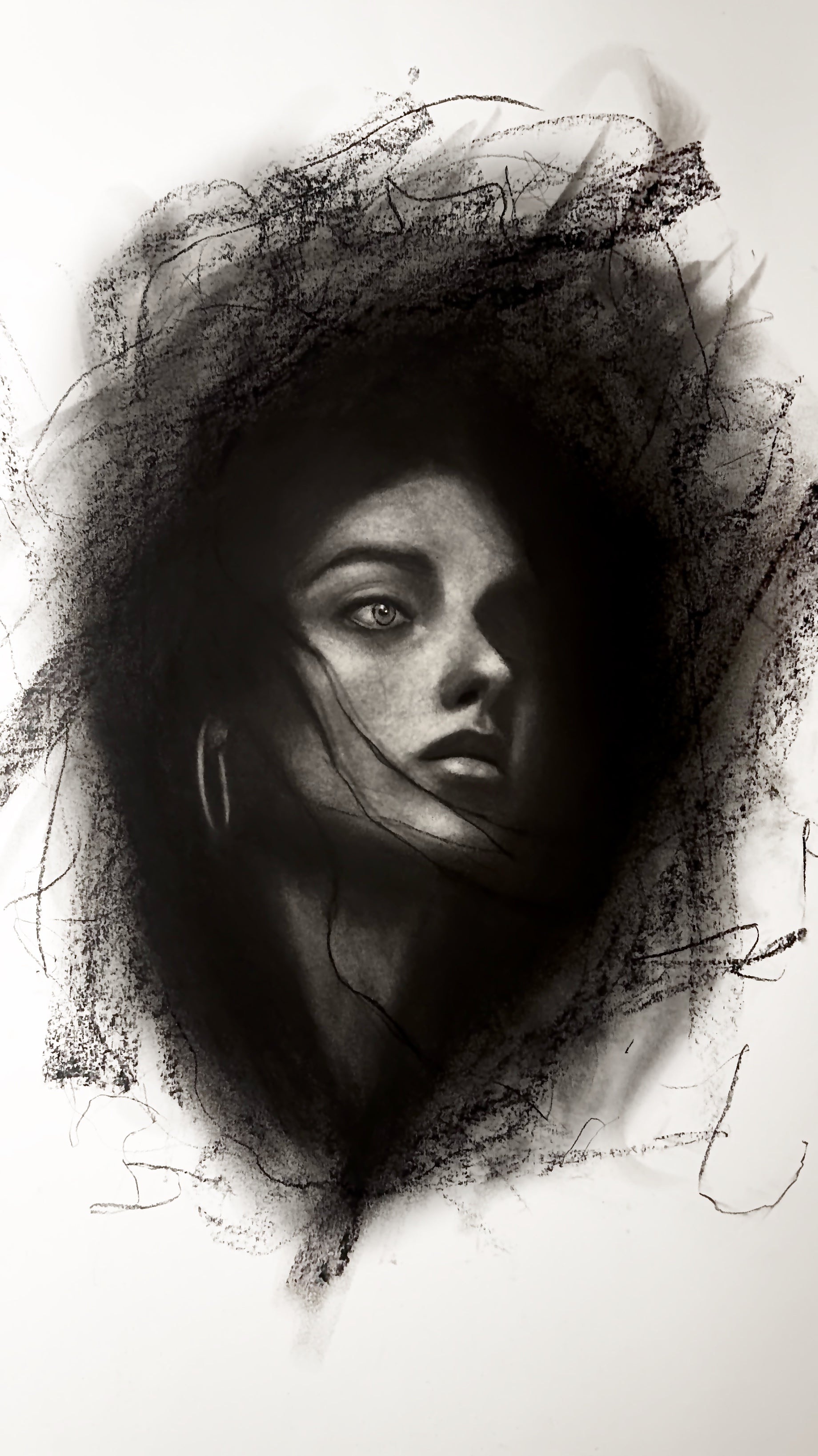 L'urlo interiore che ho cercato di catturare con il carboncino rappresenta quel momento in cui la realtà si frantuma e tutto ciò che resta è il buio, un'assenza che avvolge ogni cosa